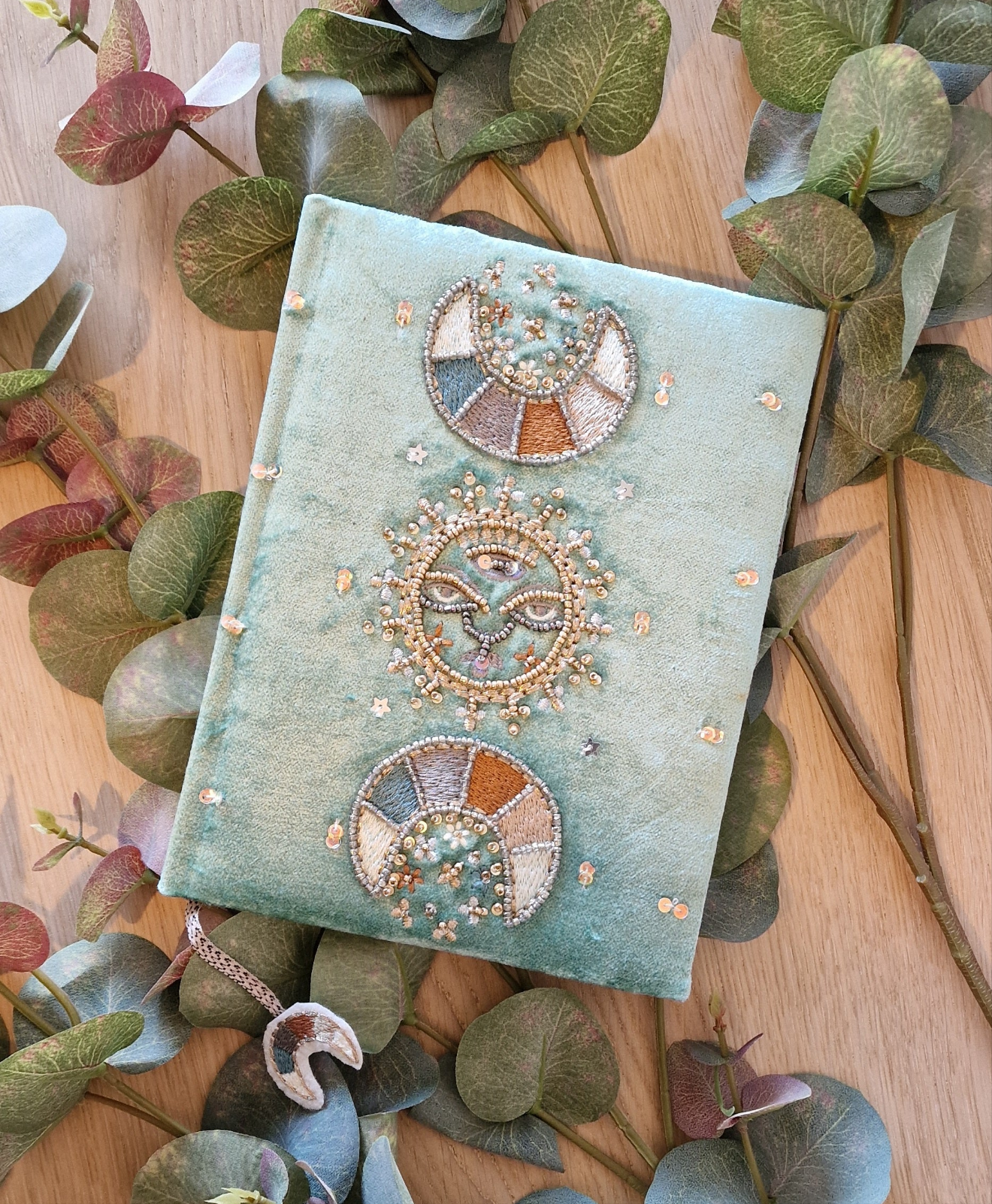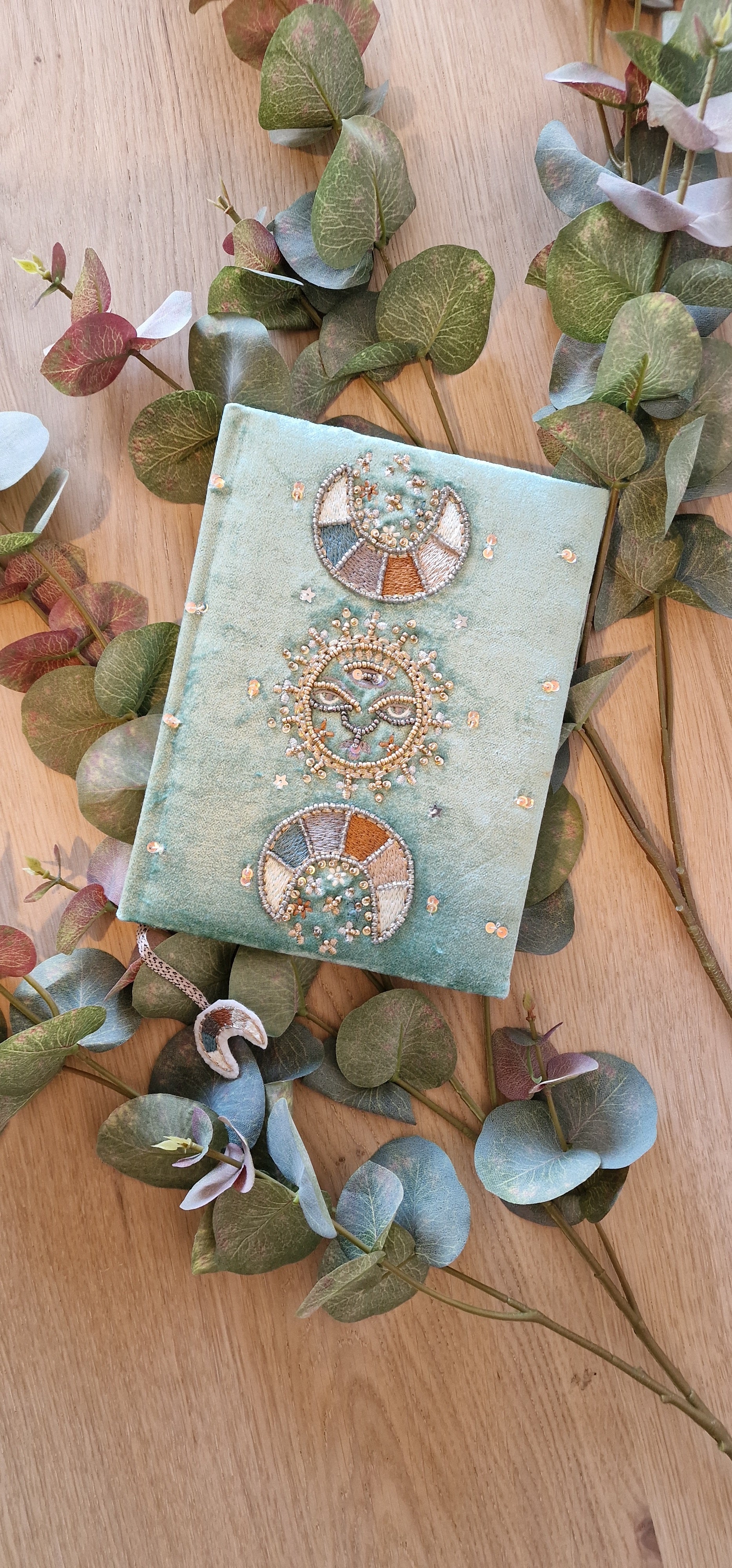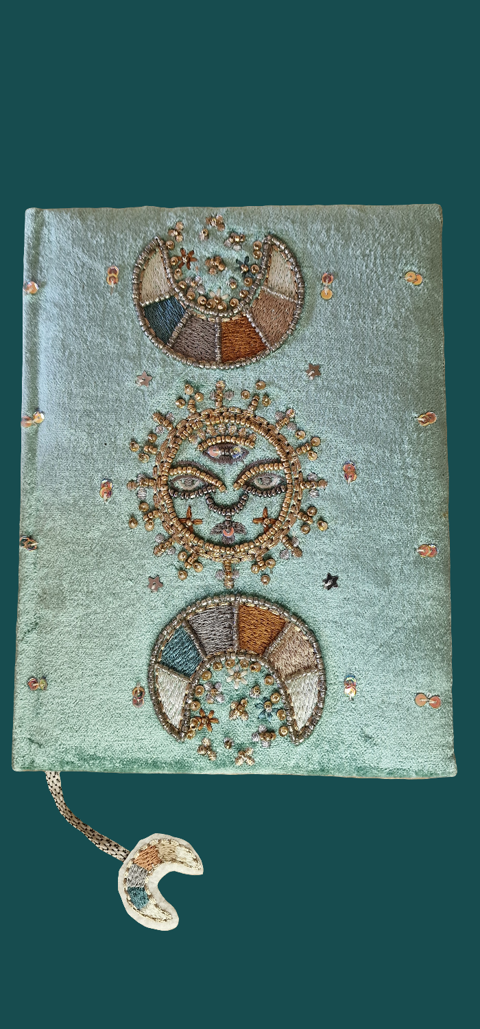 Dit notitieboek heeft een zacht fluwelen kaft met fijn borduurwerk en decorative kralen. Ook heeft het boek een decoratief lint als boekenlegger.